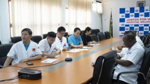 chinoise stationnée au Mozambique et des médecins de l’Hôpital central de Maputo assistent à une consultation médicale à distance avec l’Hôpital de Chine occidentale de l’Université du Sichuan, à Maputo, au Mozambique, le 21 avril 2025. Cette consultation s’inscrit dans le cadre de la coopération médicale en cours de la 25e équipe médicale chinoise au Mozambique.