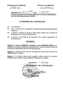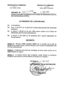Par décret présidentiel n°2017/599 du 11 décembre 2017, rendu public au Poste National de la CRTV, Okié Johnson Ndoh quitte les Services du Contrôle Supérieur de l’Etat où il était Conseiller Technique N°2 pour la Direction de la Caisse de Stabilisation des Prix des Hydrocarbures (CSPH).