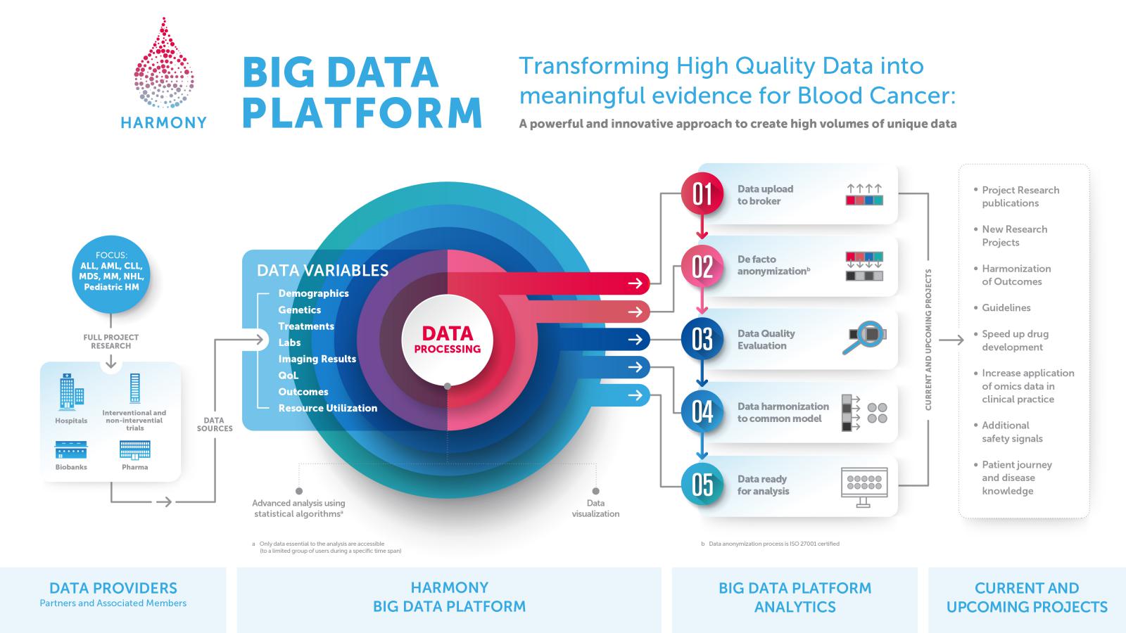 Comprenant les données de 45 000 patients atteints de cancers du sang, la plate-forme HARMONY Big Data est l’une des plus grandes de ce type au monde. Les scientifiques de HARMONY utilisent la plate-forme pour caractériser le paysage moléculaire des hémopathies malignes, comprendre leur physiopathologie et identifier de nouvelles cibles médicamenteuses.