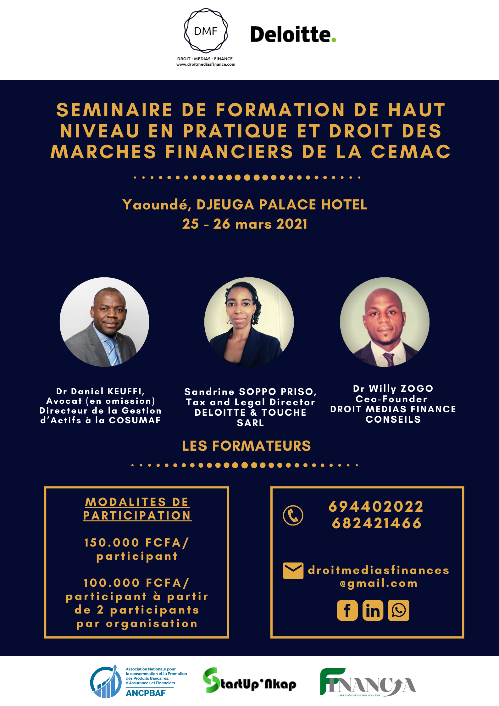 En partenariat avec Deloitte & Touche Afrique centrale, le cabinet séminaire de formation organise un séminaire de formation de haut niveau en pratique et droit des marchés financiers de la CEMAC.