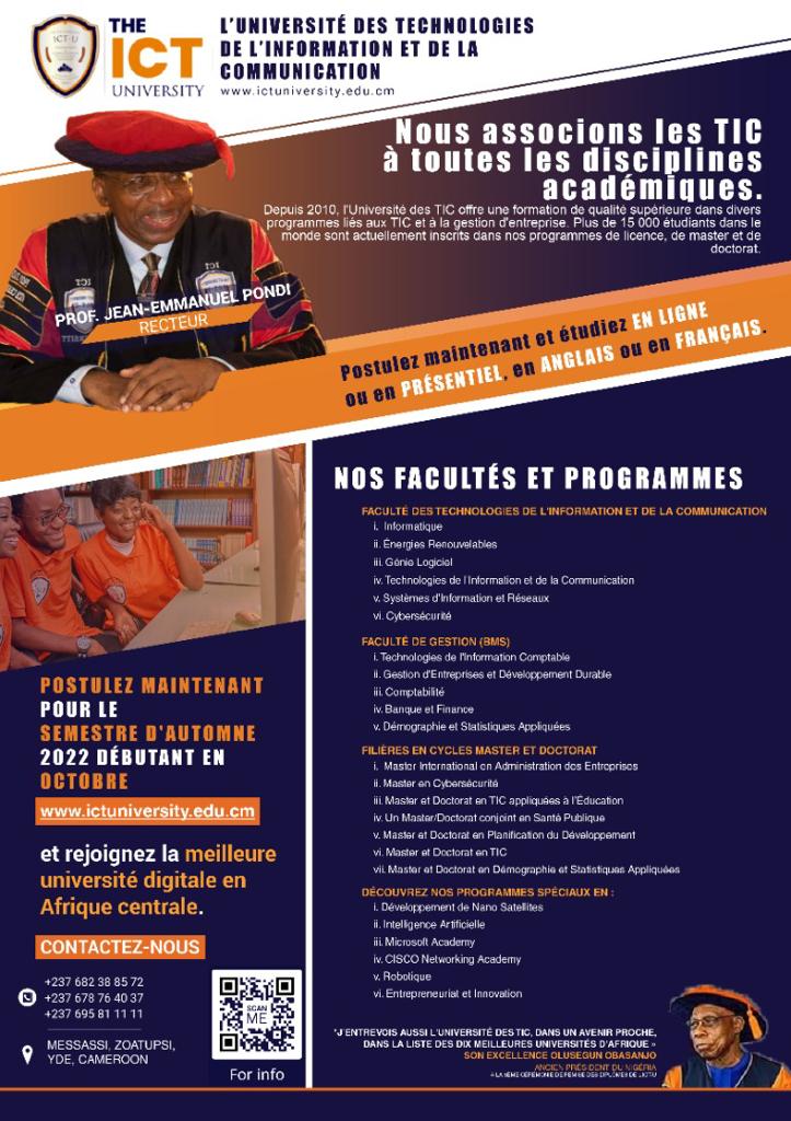 Postulez – Rejoignez la Meilleure université numérique en Afrique Centrale en 1 clic ICI ictuniversity.edu.cm – Tel:+237 651 060 049 – admin@ictuniversity.edu.cm