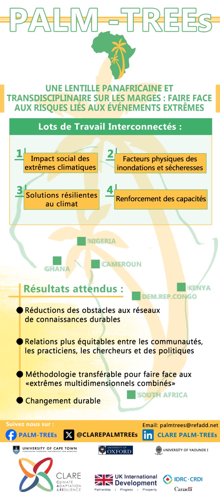 Le projet PALM-TREEs, financé par le CRDI-FCDO CLARE et lancé lors de la Semaine africaine du climat 2023 à Nairobi, vise à faire progresser la recherche sur les extrêmes climatiques en Afrique subsaharienne en tenant compte des besoins et des expériences des parties prenantes et des communautés. Il adopte une approche transdisciplinaire et panafricaine pour transformer la compréhension des événements climatiques extrêmes en « extrêmes composés multidimensionnels ».