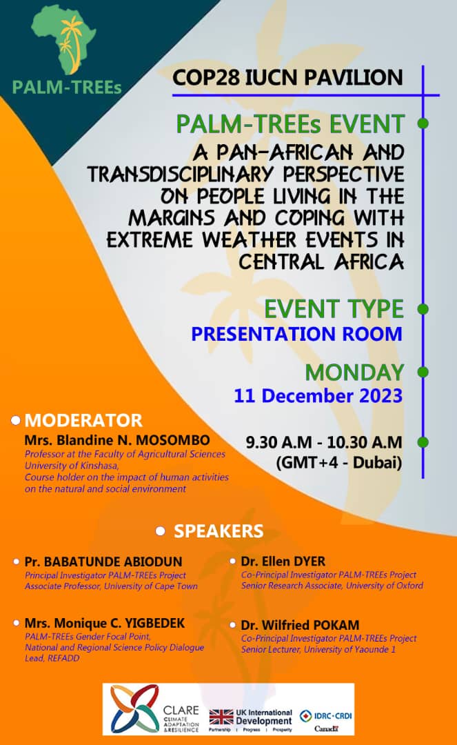 Événement parallèle à la COP28 du projet PALM-TREEs financé par CLARE : Une perspective panafricaine et transdisciplinaire sur les personnes vivant en marge et faisant face aux événements extrêmes en Afrique centrale.
