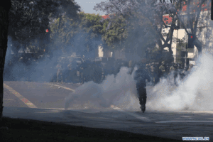 Selon le reportage, des agents de la police des frontières en tenue anti-émeute et équipés de masques à gaz montaient la garde à l’extérieur d’un parc industriel, lançant des gaz lacrymogènes alors que les manifestants se rassemblaient sur les terre-pleins centraux et de l’autre côté de la rue, certains huant les autorités tout en filmant les événements avec leurs téléphones.