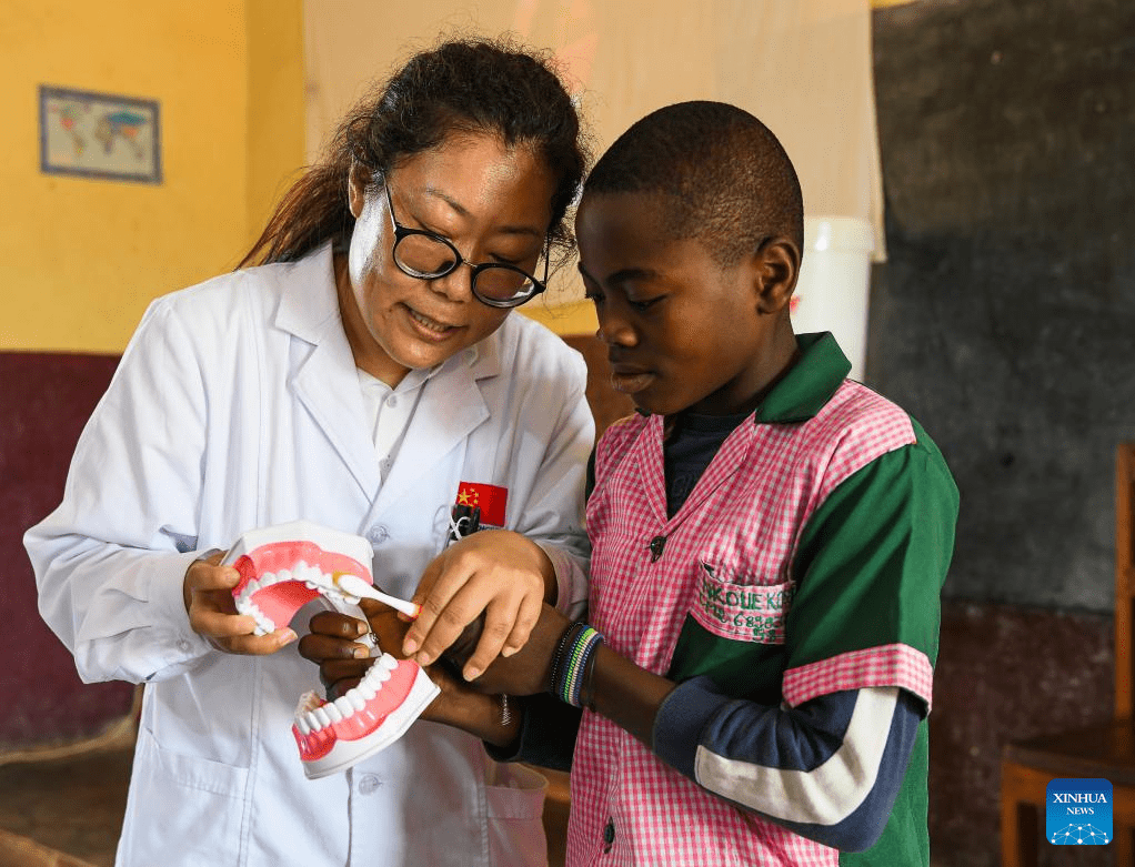 A Chinese doctor demonstrates correct way of brushing teeth to students of a primary school in Mbalmayo, Cameroon, on April 3, 2025. A Chinese medical team working in Cameroon on Thursday provided free health care services to a primary school in Mbalmayo. The free health care services, including dental checks, health counseling and a lecture on infectious disease prevention, benefited over 80 students and teachers of the school. (Xinhua/Kepseu)