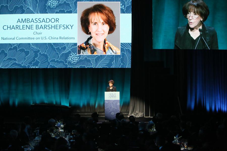NEW YORK-Charlene Barshefsky, ancienne représentante américaine au commerce et présidente du conseil d’administration du Comité national sur les relations Etats-Unis-Chine (NCUSCR), prend la parole lors du dîner de gala annuel du NCUSCR à New York, aux Etats-Unis, le 14 octobre 2025. Les intervenants au gala ont appelé à la poursuite du dialogue, à un engagement concret et à une collaboration accrue entre Washington et Beijing afin de stabiliser les relations bilatérales les plus importantes au monde.