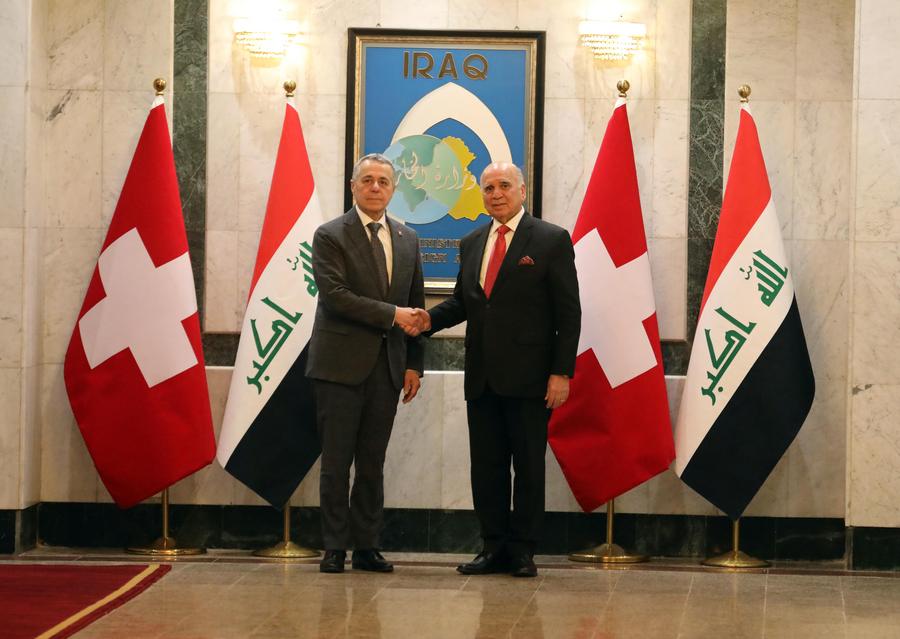 ►►Le ministre irakien des Affaires étrangères Fuad Hussein (à droite) et son homologue suisse Ignazio Cassis serrent la main lors d’une conférence de presse conjointe à Bagdad, en Irak, le 23 octobre 2025. Jeudi, une délégation suisse de haut niveau est venue à Bagdad pour discuter du renforcement de la coopération bilatérale et des investissements suisses dans des projets de développement majeurs irakiens.