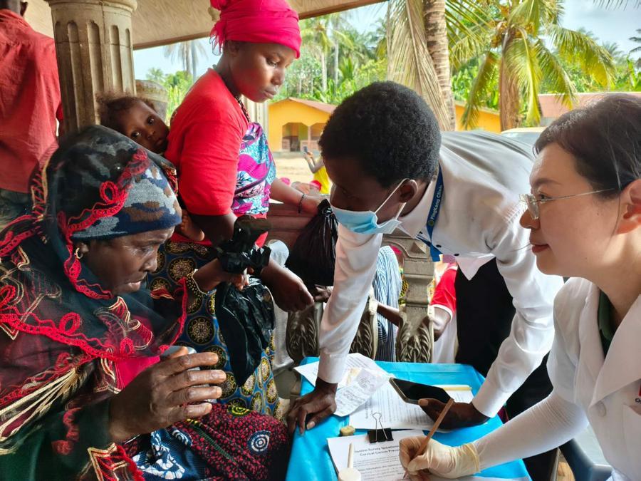 ►►Une femme médecin de la 27e équipe médicale chinoise en Sierra Leone examine une villageoise de Rokel, dans la province du Nord-Ouest, le 12 avril 2026. La 27e équipe médicale chinoise en Sierra Leone y a organisé sa première consultation gratuite offrant des soins médicaux à près de 300 villageois.