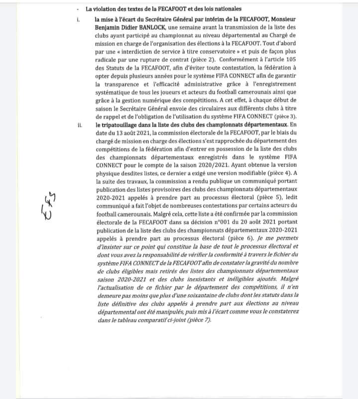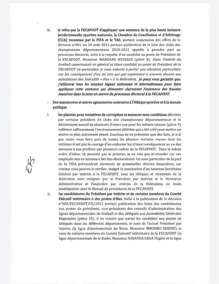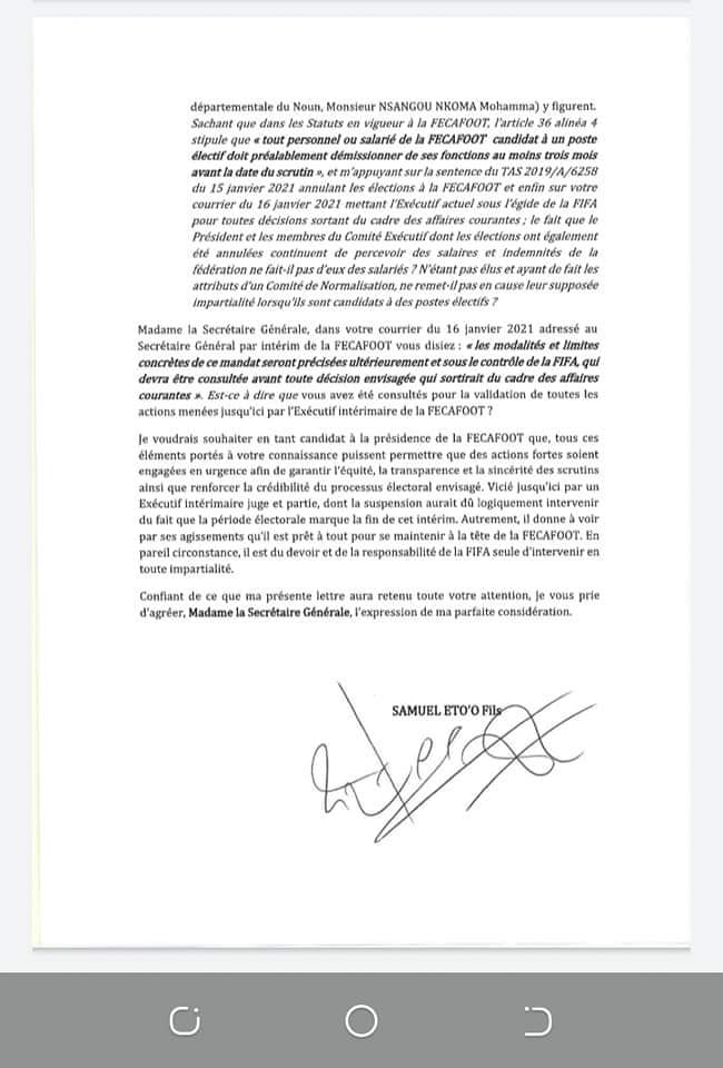 Samuel Eto’o a écrit à Fatma SAMOURA, Secrétaire Générale de la Fédération Internationale de Football Association en sa qualité de candidat au poste de Président de la Fédération Camerounaise de Football (FECAFOOT). Il fait part des faits et actions de « nature à jeter du discrédit sur tout le processus électoral à la FECAFOOT et à constituer des griefs suffisants pouvant entraîner une annulation dudit processus ».